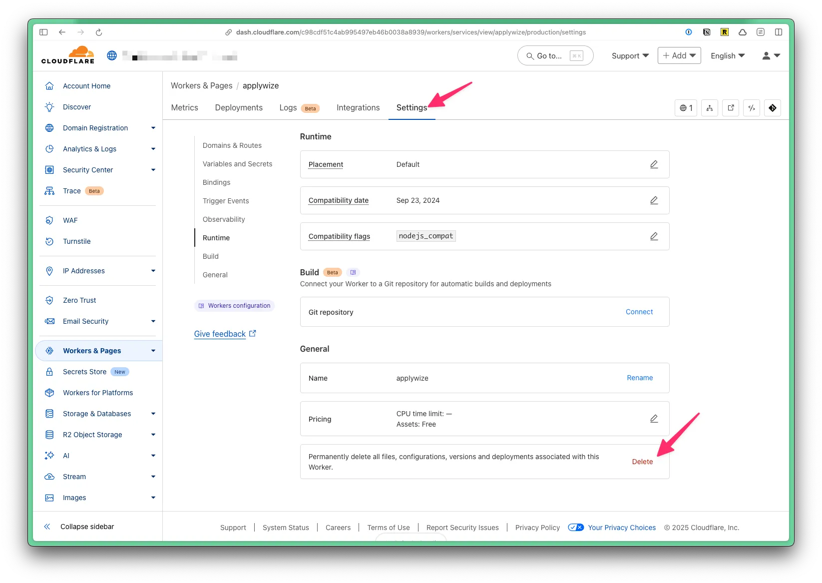 Section titled “Deleting Your Project”If for whatever reason, you need to delete your project through Cloudflare, go to Workers & Pages in the left side navigation. Then, click on the name of your project. Click on the Settings tab, then scroll to the bottom of the page. Click on the Delete button.