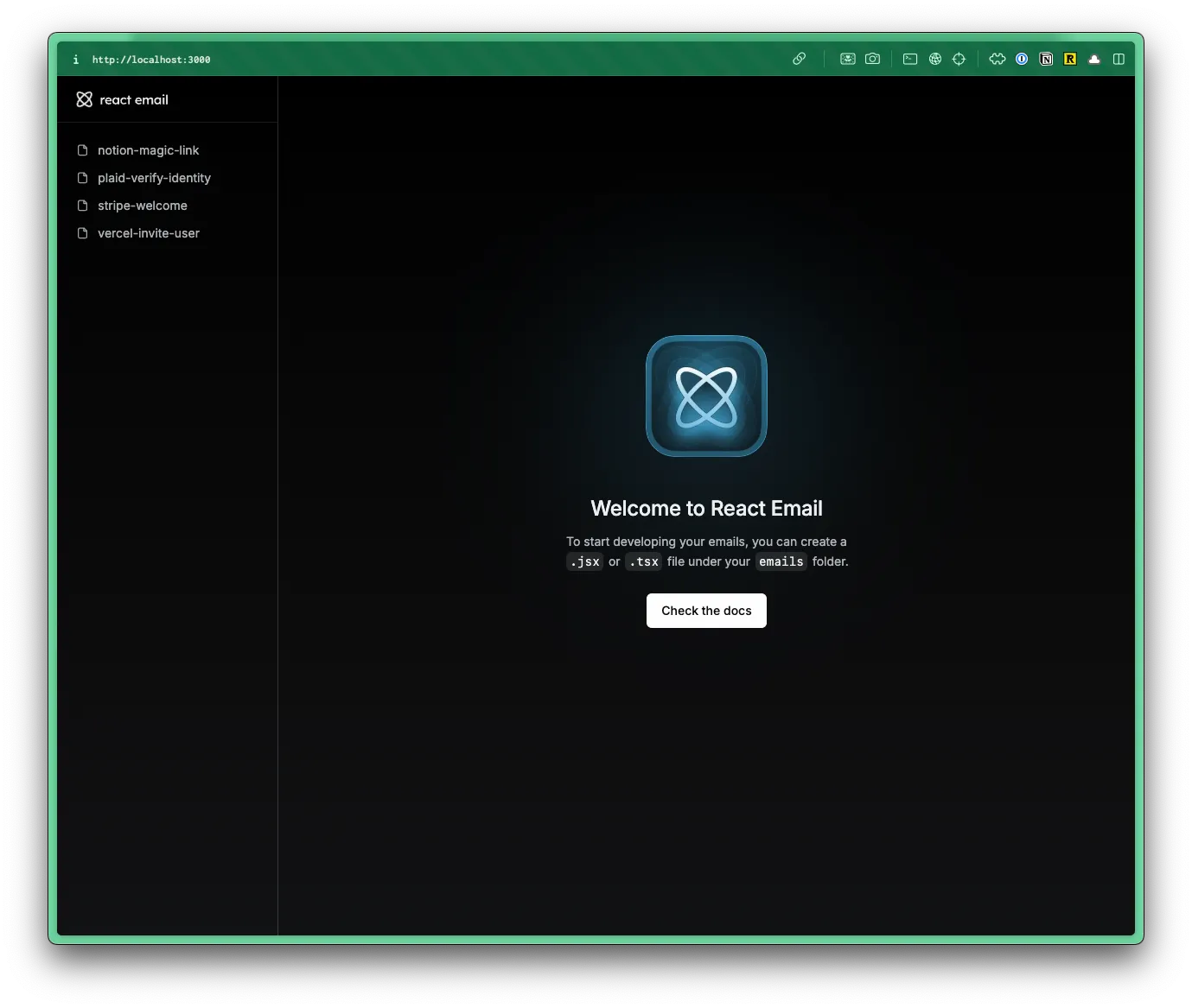 In the left sidebar, you’ll notice that React Email has 4 email examples you can preview. These correspond with the .tsx files inside the react-email-starter/emails directory: